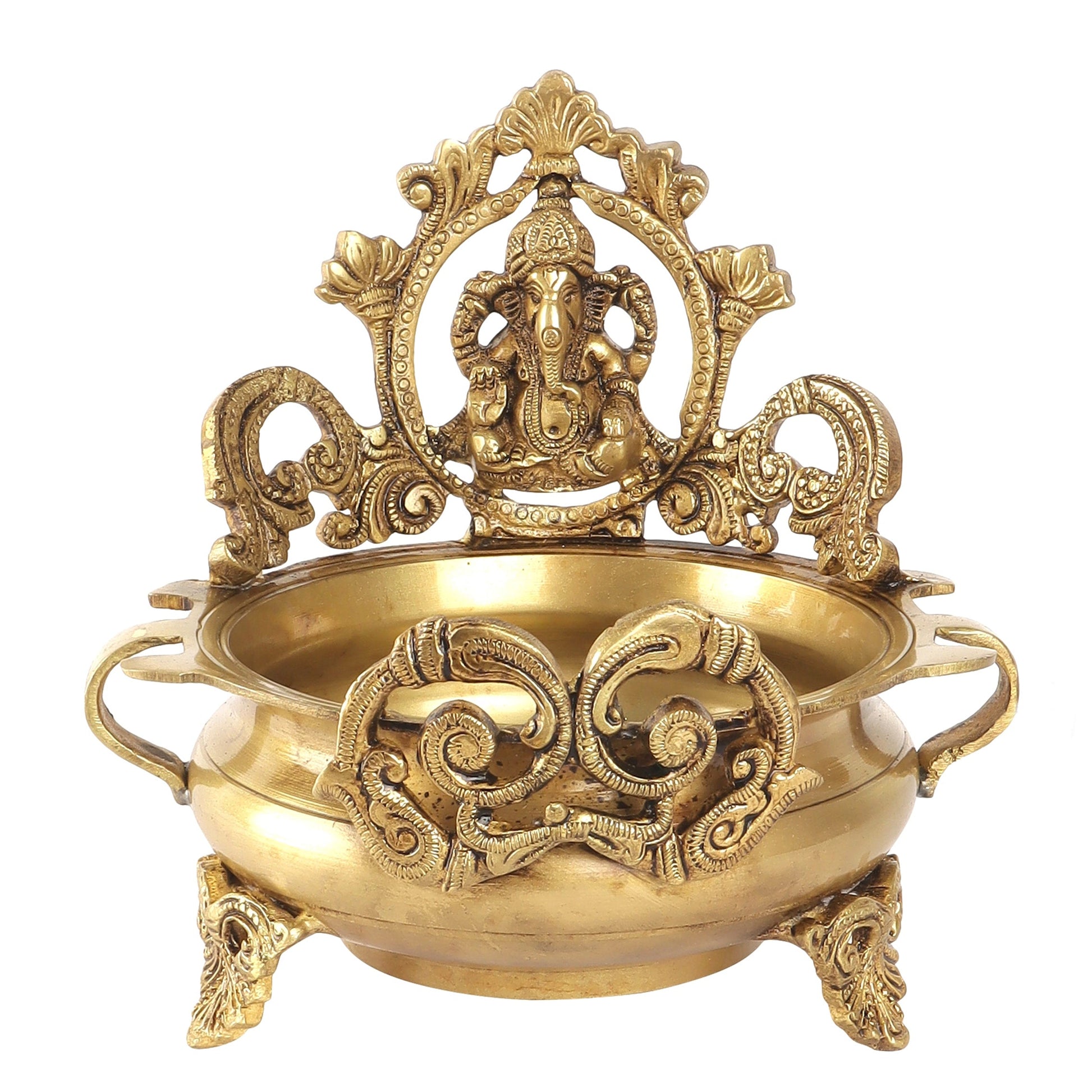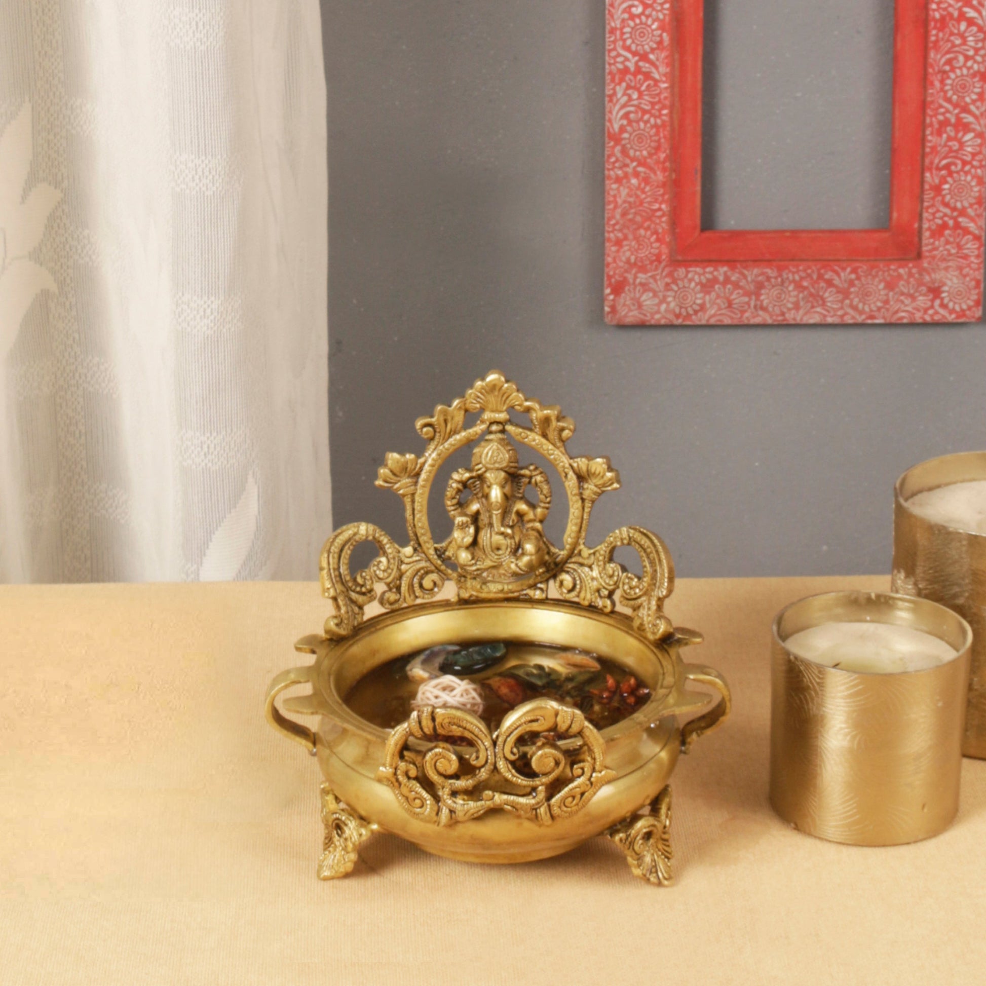 Easily recognizable by its distinctive shape, the urli makes a handsome addition to the decor of any room, and now, you can enjoy the beauty of one that is made according to the time-honored traditions in your own home with the Handmade Brass Ganesha Design Urli.