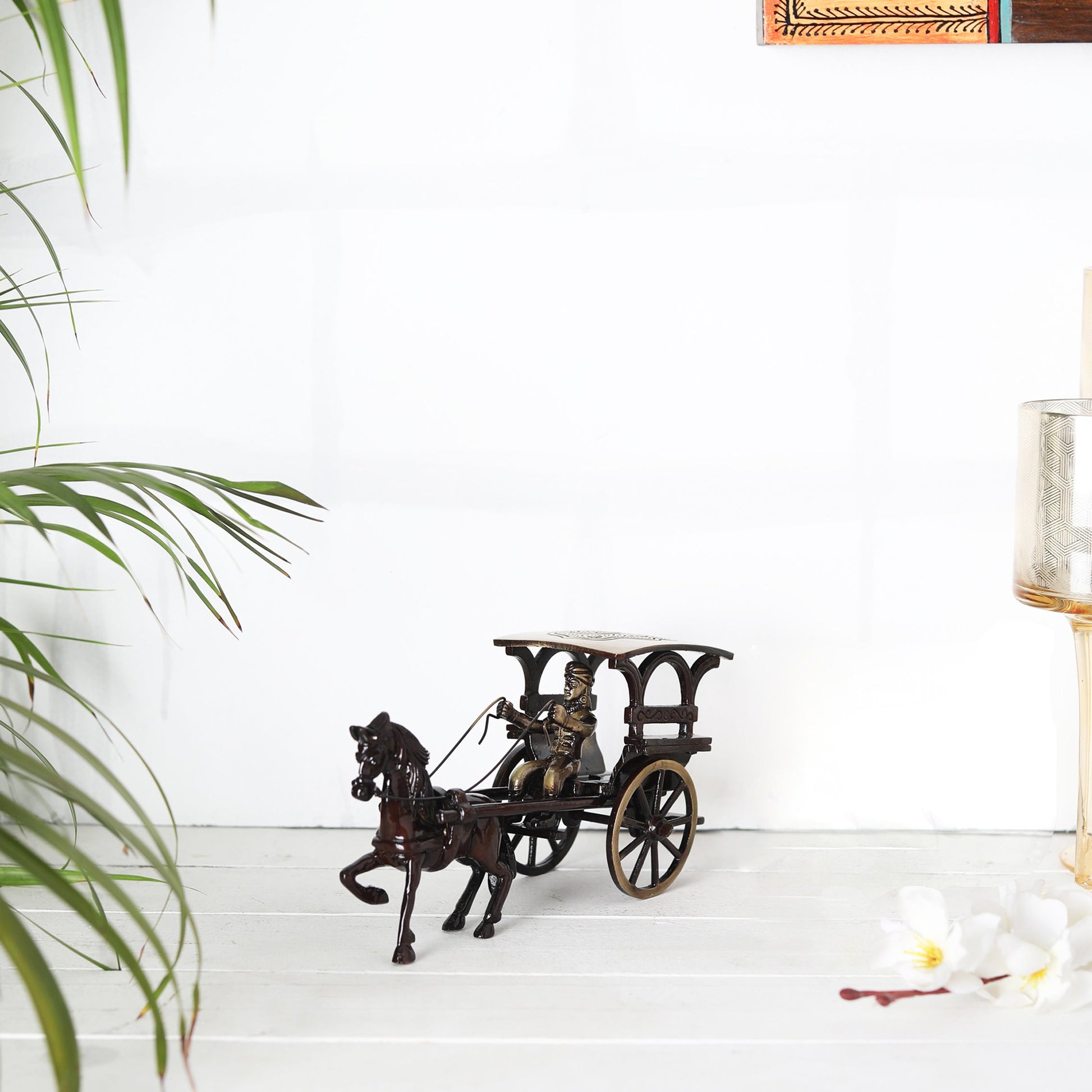 A modern day brass miniature; this horse carriage is an exact replica and is a reflection of the traditional European way of life. The details are breath-taking and it makes a perfect gift for any occasion. This completely brass-made horse cart has an enticing antique look. Every edge of this magnificent brass product has beautiful etching patterns.