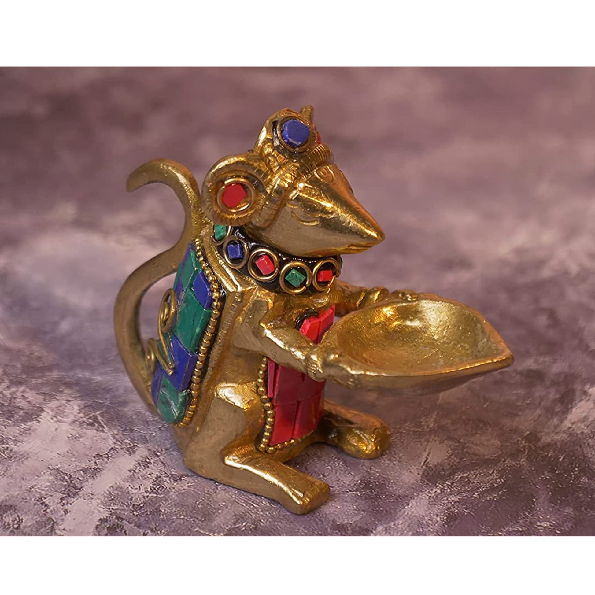 Brass Gemstone Work Ganesha Mouse Holding Oil Lamp Diya