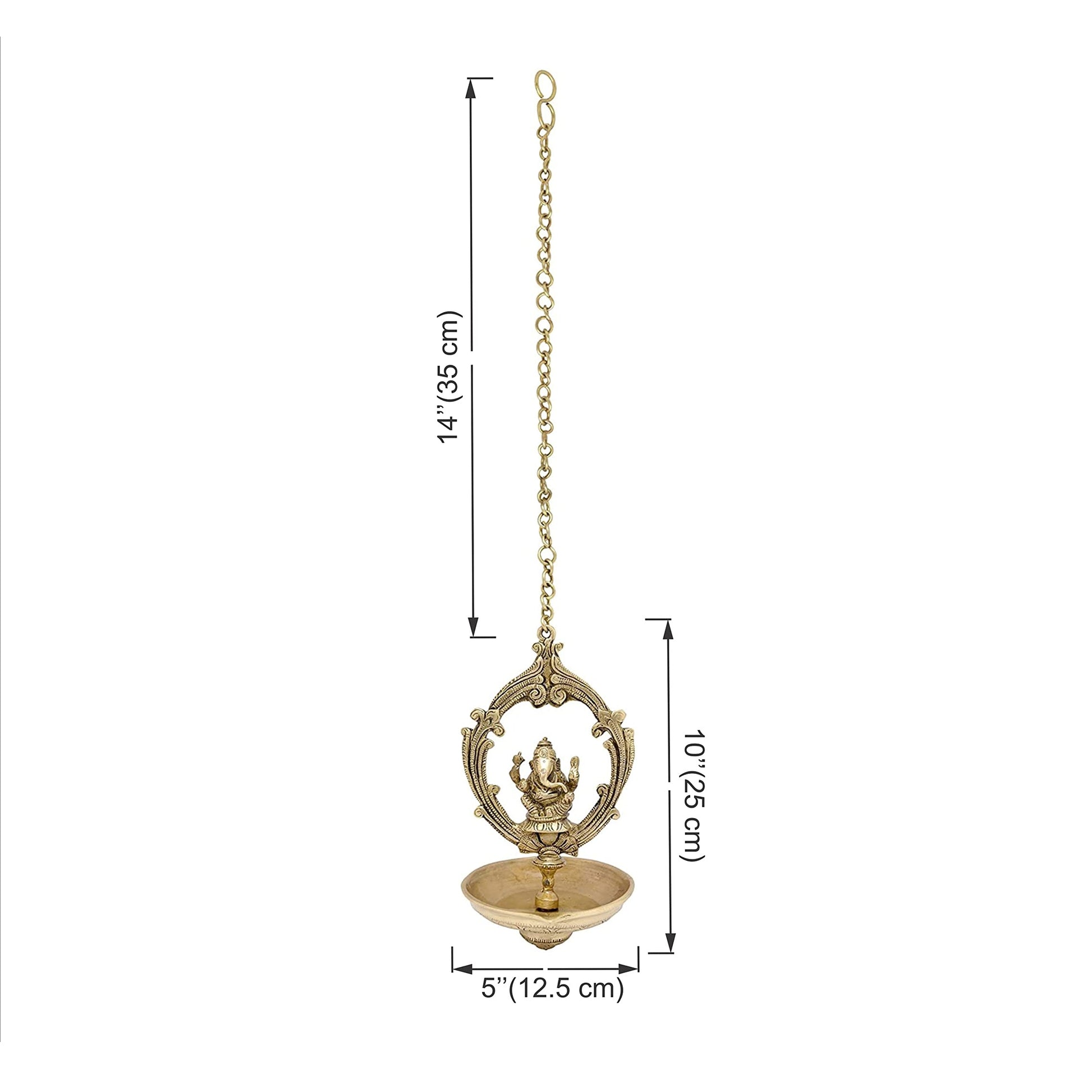 A Diya is of great importance for Hindu who lights it up every day to bring positive energy to their homes. The brass Diya which illuminates the room is accompanied with the Hindu deity Ganesh seated on top. The lamp set with a chain is a solid brass sculpture to add an exquisite touch to your modern homes and may bring forth light in dark Amavasya night of Diwali.