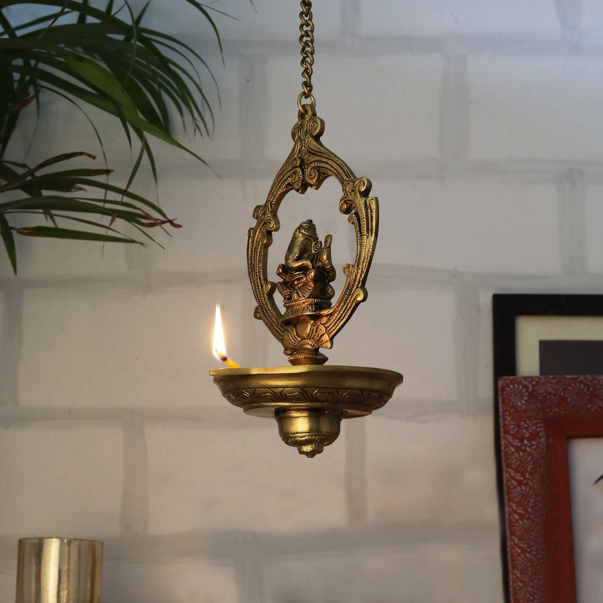 Brass Handmade Ganesha Design Oil Wick Hanging Diya, Diyas for Home Decor