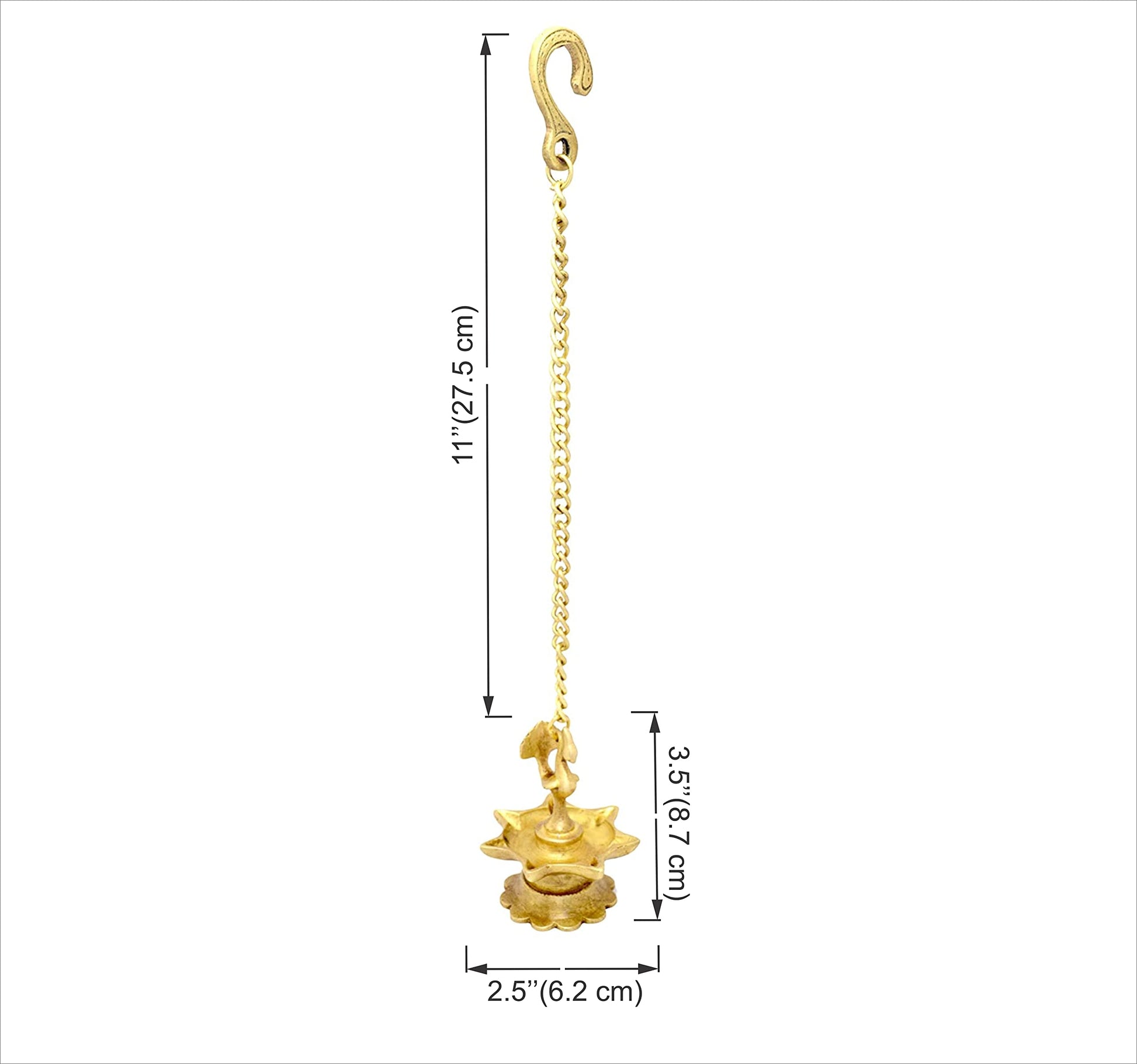 These are also used as Diwali lights when whole India gets lighted on the dark Amavasya night. There is also beautiful peacock seated on the top. The lamp set comes with a hanging chain. Made in brass, this is a solid piece of collectible figurine sculpture that you would be happy to keep at your home. Gift your loved ones this attractive Diya set for special occasions.
