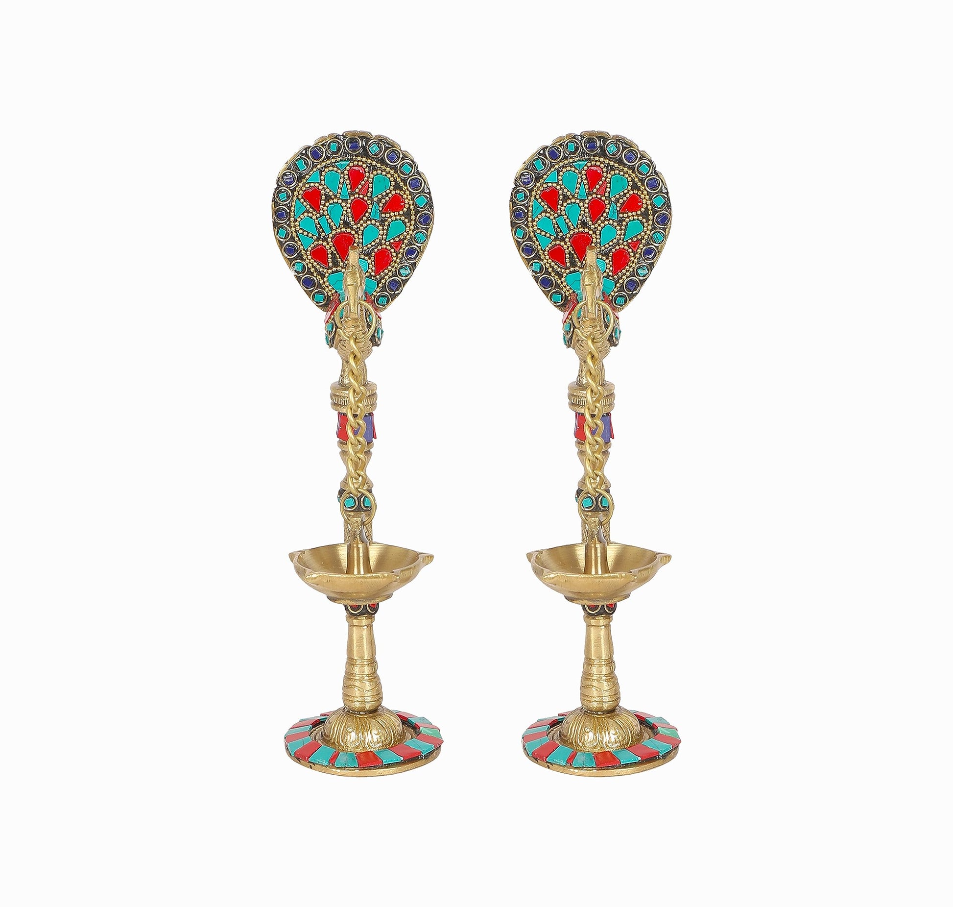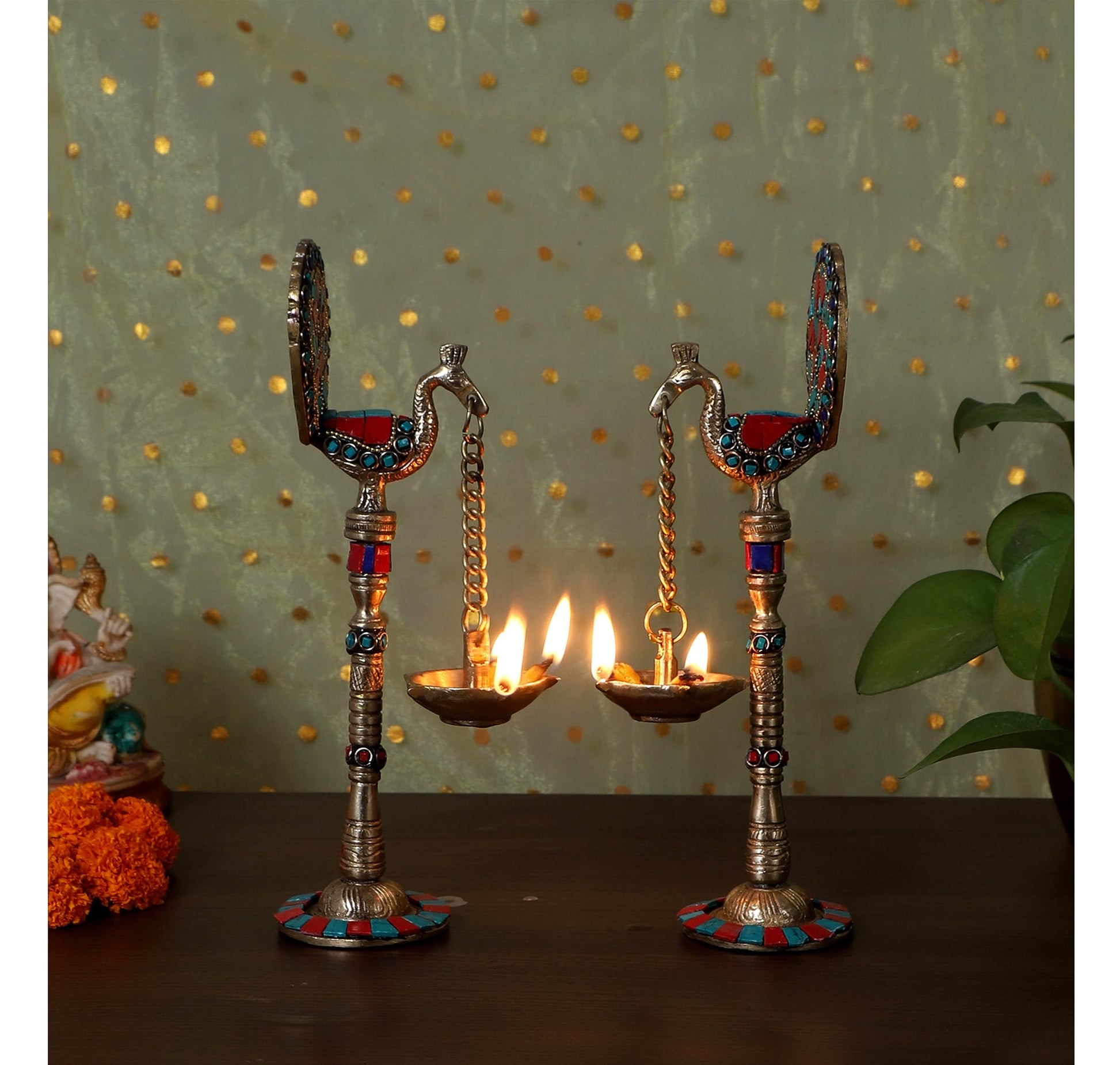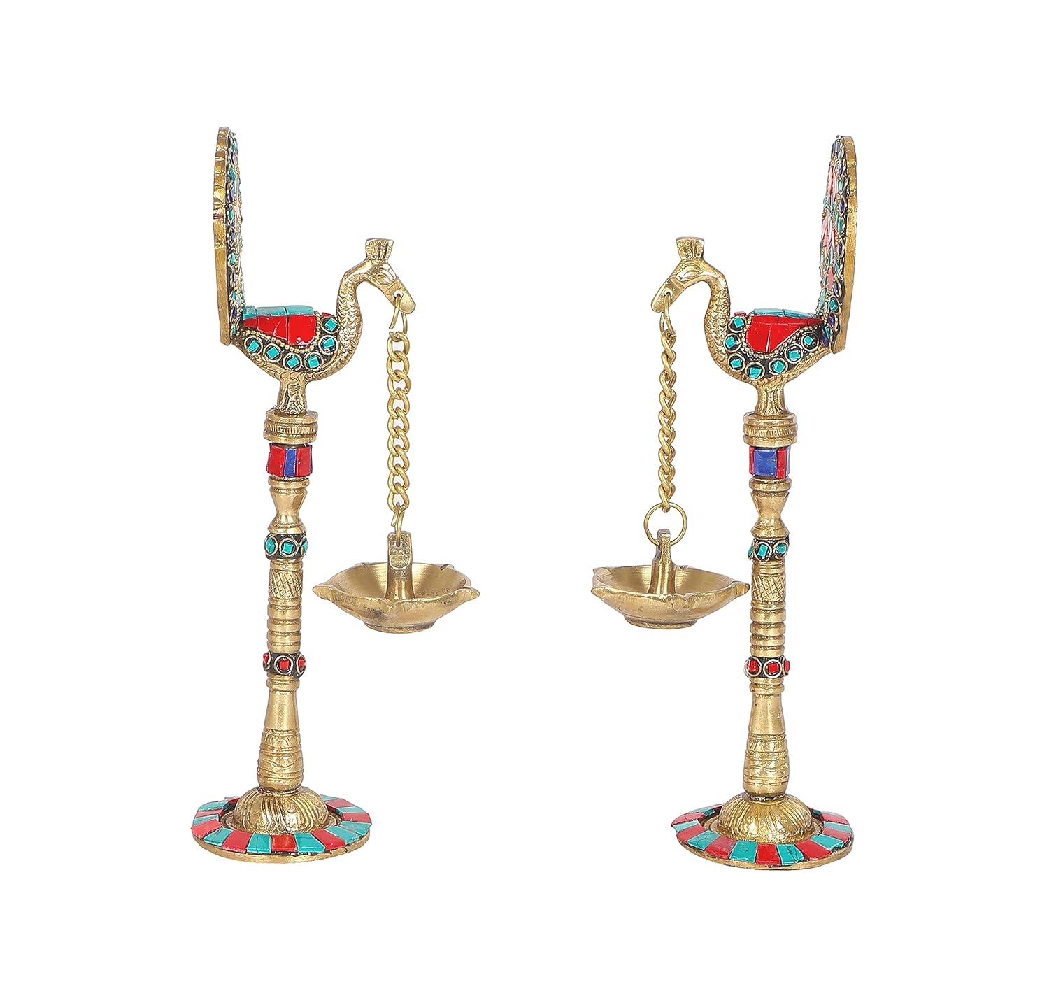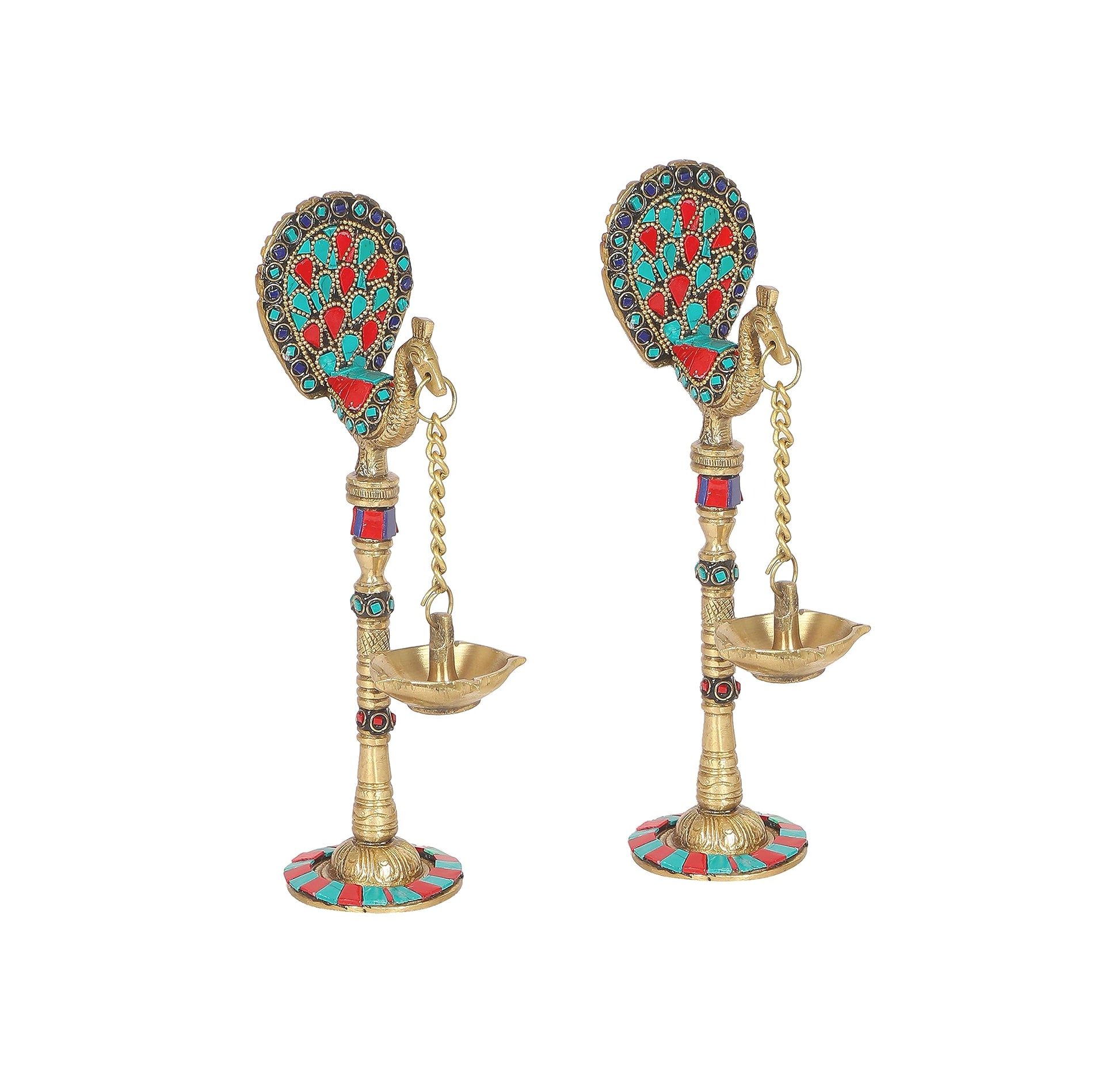 Gemstone Work Peacock Design 9 Inches Brass Hanging Diya Pair