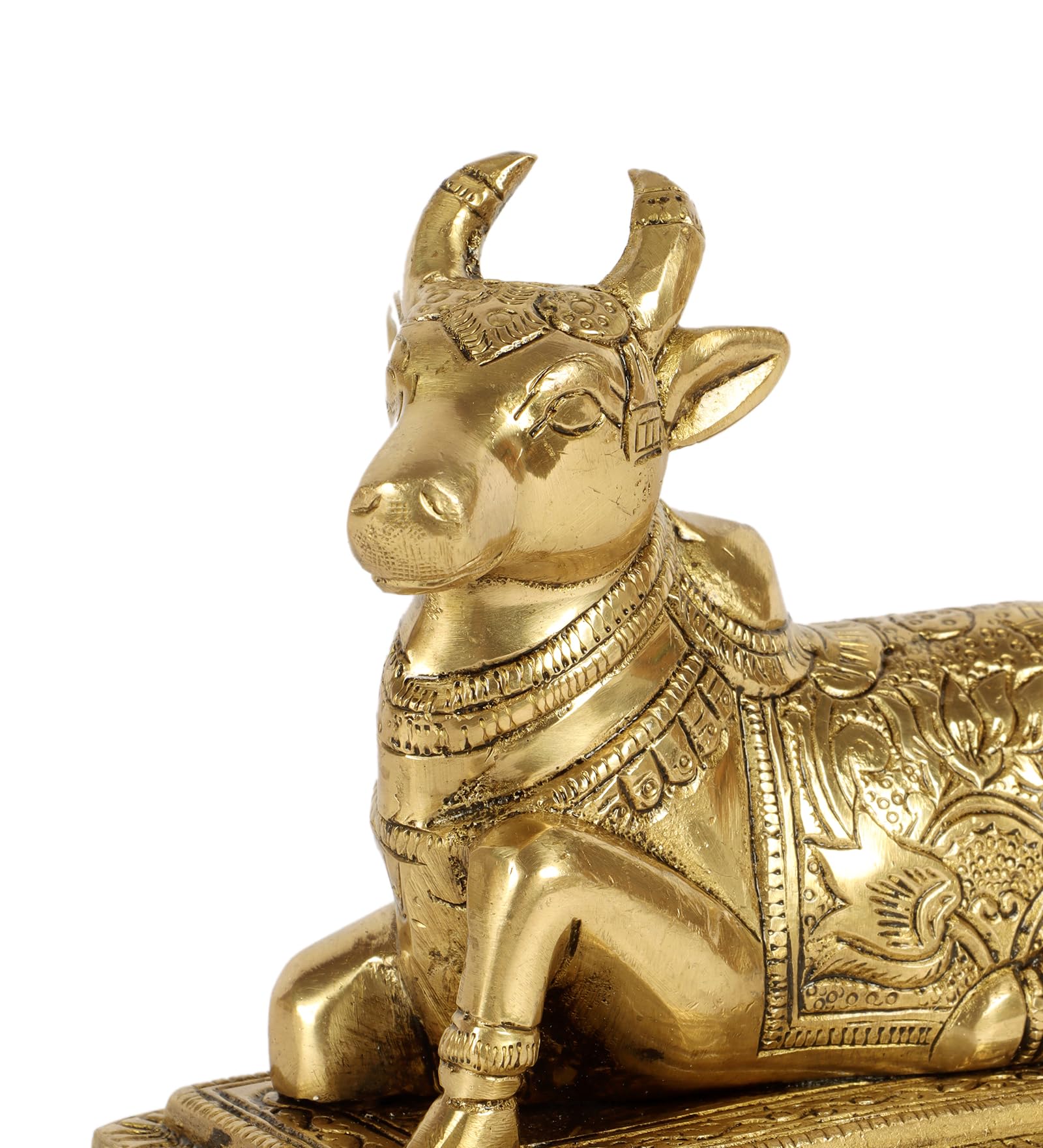 Lotus Engraved 5 Inches Brass Nandi Cow Over Base Statue